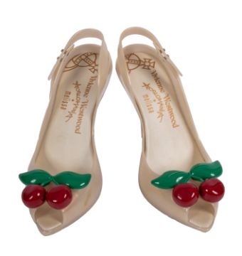 Vivienne Westwood. a Pair of Vivienne Westwood Anglomania and Melissa silver high heels with cherry detail to the toe, size 40.