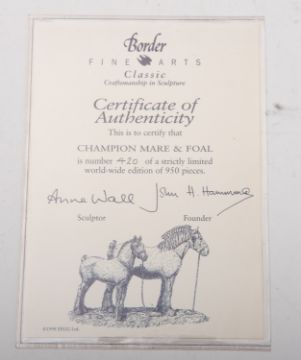 Border Fine Arts 'Champion Mare and Foal' figural group, shown haltered in standing positions with rosettes on a plinth base, number 420 of 950 and signed Anne Wallar to the base, with certificate, 25cm high.