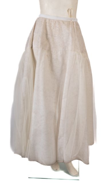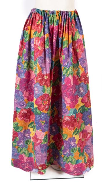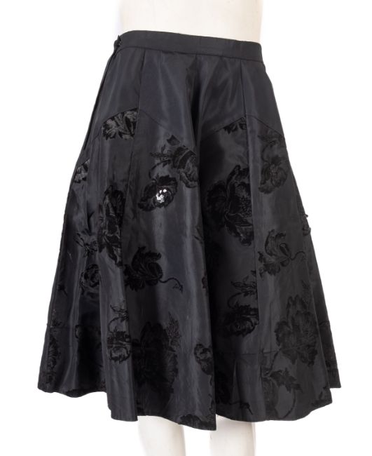 A group of four 1960's skirts, including a cream and silver full length skirt with a homemade net petticoat, black skirts and other homemade multi-coloured full length skirt, together with a pair of red cord pencil trousers. (6)