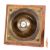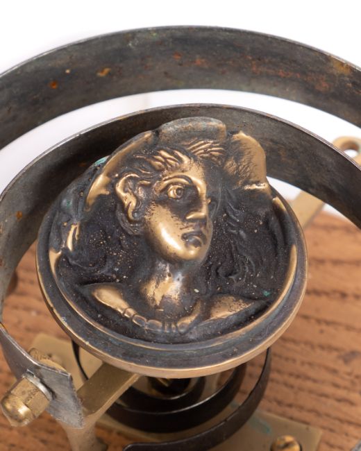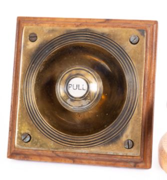 An early 20th Century brass 'pull' door bell. The mechanism mounted on a wooden block with string and pulley system, the bell showing a female bust to the centre.