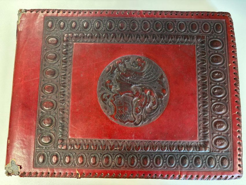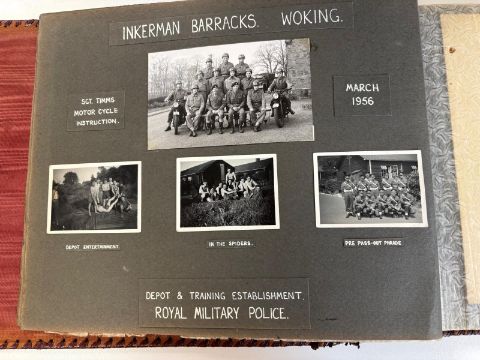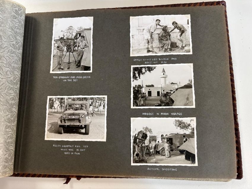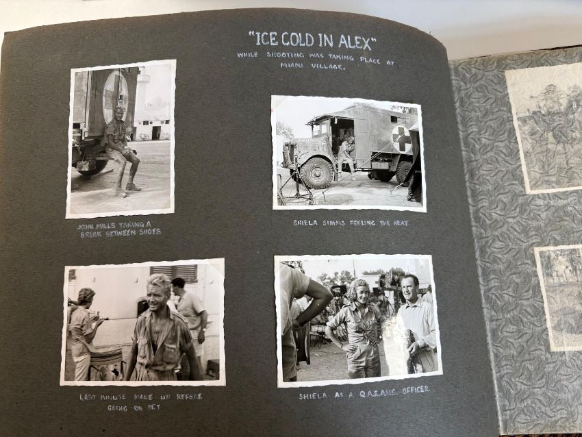 Ice Cold in Alex (1958): An interesting post-war album of photographs compiled by a British serviceman, beginning at Blenheim barracks Aldershot, then to Tripoli and Cyprus. Approx 180 b/w photographs of military life and surroundings, corner mounted, many with accompanying annotations, including a sequence of nine personal photographs taken during the shooting of 'Ice Cold in Alex', Miani village (sic), includes John Mills 'taking a break between shots': 'Shiela (sic) Sims feeling the heat', etc, neatly arranged in oblong folio album of period, embossed soft red leather covers.