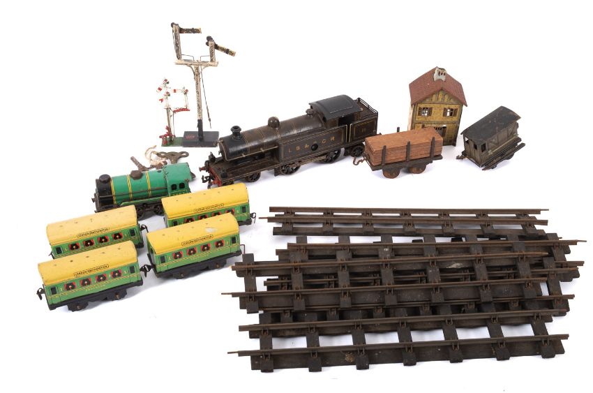 An O gauge Bassett Lowke or similar LB&SCR 4-6-2 clockwork tank engine. In brown with black trim and complete with key, together with two carriages and track plus a smaller gauge tin plate locomotive and coaches etc.