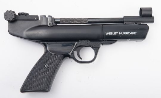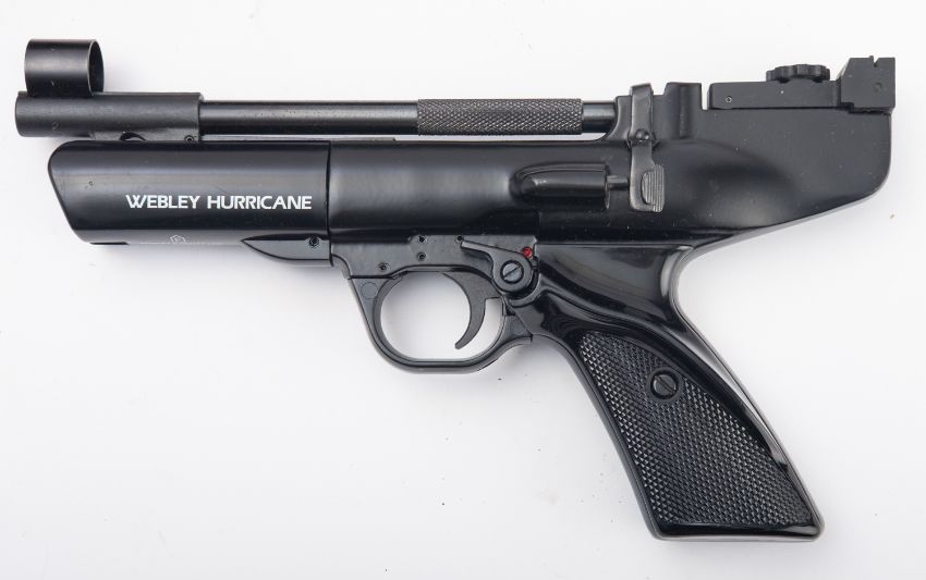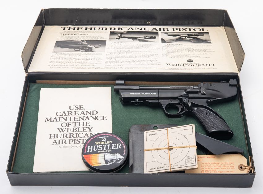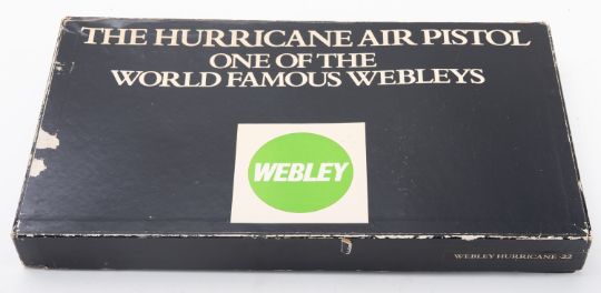 A Webley Hurricane air pistol. .22 calibre in presentation box with pellets, target holder, telescopic sight bracket and instruction booklet etc.
