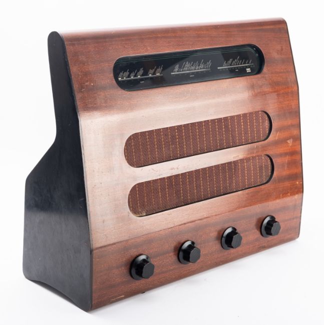 A circa 1947 Murphy A122 valve mains radio. Serial number 404921, having a mahogany body and plastic dials, 47cm high, 46cm wide.