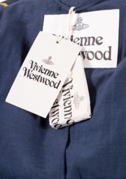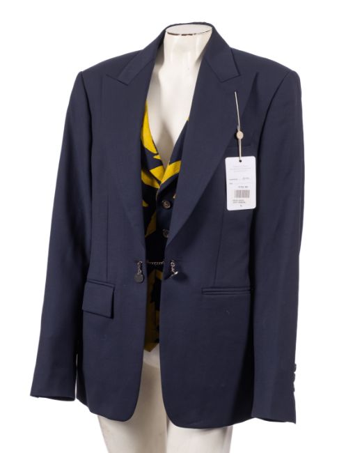 Vivienne Westwood. A Vivienne Westwood navy wool blend blazer with an integrated navy and lime green patterned waistcoat, size 40, with original tags attached.