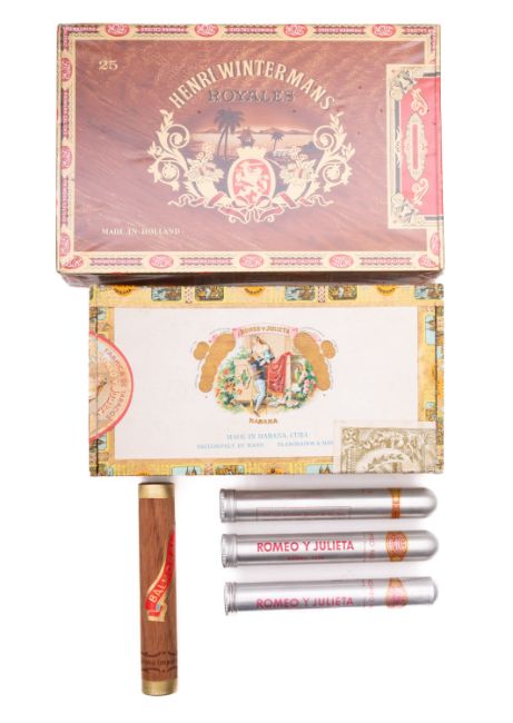 A part box of Romeo and Julieta Cuban cigars. Together with three Romeo and Julieta no. 2 cigars in metal cases, plus a sealed box of 25 Henry Winterman Royales etc.