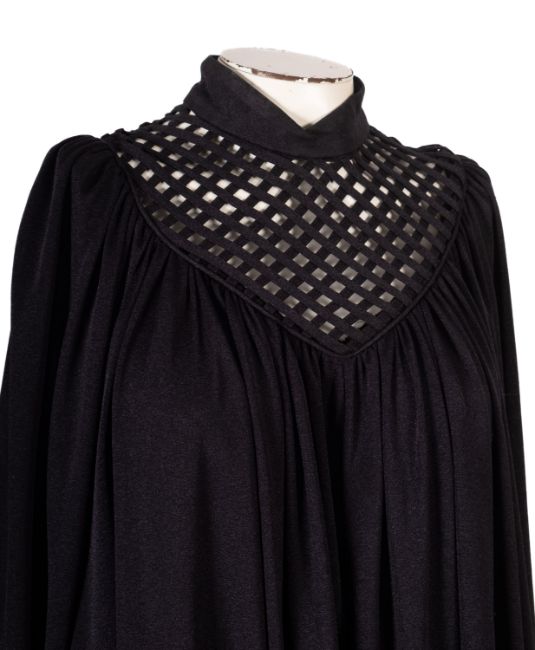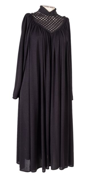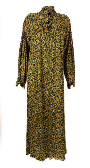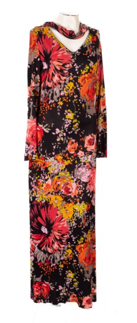 A group of three 1960's and later style dresses, including a 'Horrockses Fashions' black and pink large floral print full length dress with tie back detail to the back, together with a green and blue polka-dot style pattern fabric full length dress with cuffed sleeves and large black buttons to the front, and a black long sleeve high neck dress with a v-neck woven detail to the front, size 40. (3)