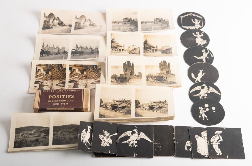 A group of WWI stereoscopic cards, together with a small collection of optical cards and a set of later French erotic 'Revue Du Concert, Mayol' stereoscope card..