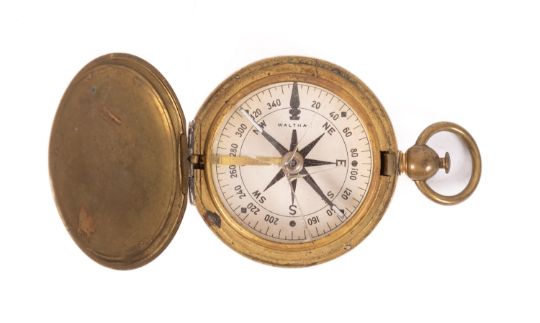 An American brass pocket compass by Waltham, initialled 'US' to front