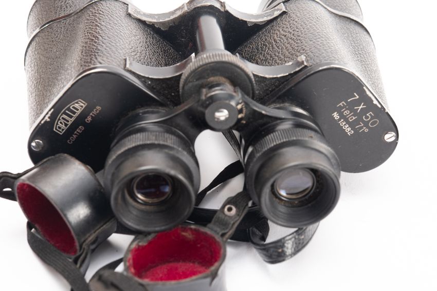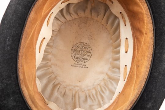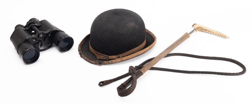 A Swaine & Adney riding crop, together with a Lock & Co bowler hat 63cm circumference and a pair of Apollon 7x50 field binoculars.