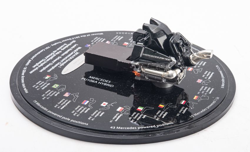 A 2014 Formula One Mercedes world constructor's champions trophy. Presented to Colm Lawlor 526/596 having a model of the Mercedes PU106A Hybrid engine mounted on a black circular plinth with perspex dome, 15cm high, 26cm diameter.