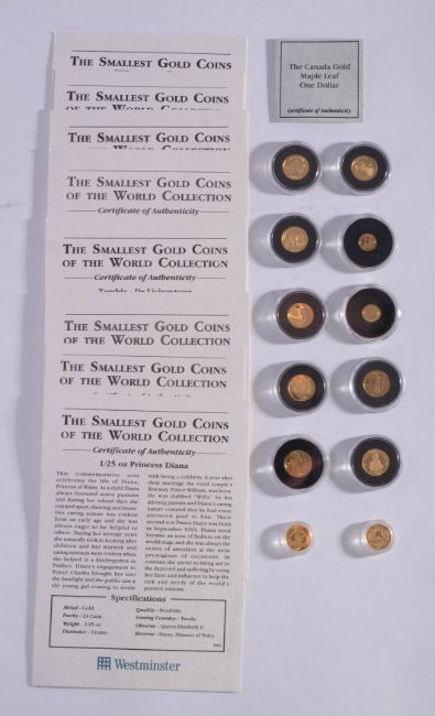 The smallest gold coins of the world collection. Eleven coins including Canadian fine gold 1/20thoz gold coin etc.