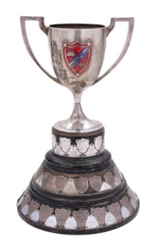 A George V silver two handled presentation trophy by J.C, Birmingham 1913, 7 O'clock swimming Club, Plymouth, The Frost Perpetual Trophy 1912 with two red and blue enamel plaques set on a stepped base, and shield presentation plaques