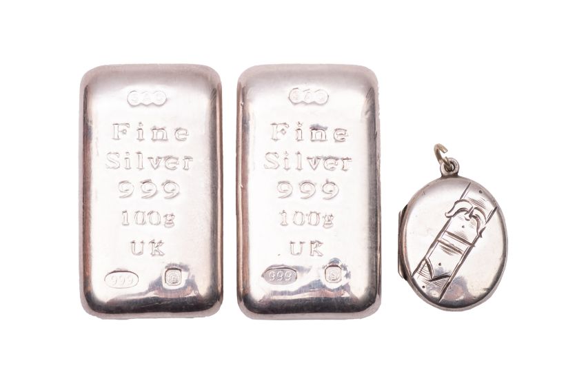 Two fine silver 100g ingots. Stamped 'Fine Silver 999 100g UK' to the front, together with a silver locket marked London, 4.4g.
