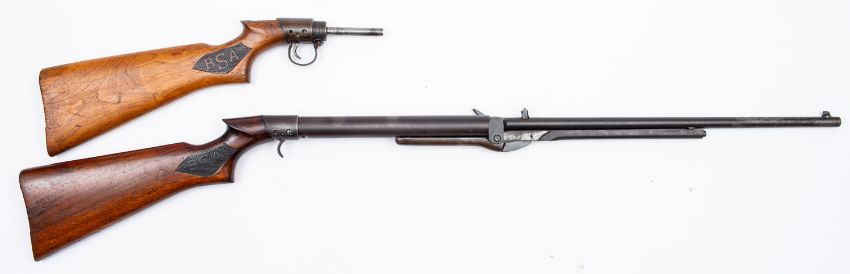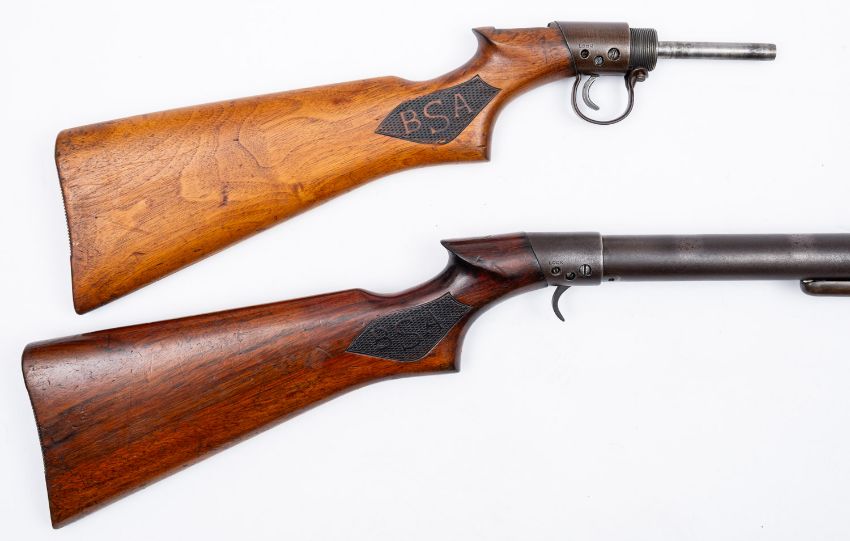 A BSA Club Standard underlever Air Rifle. Serial number CS35500, .177 calibre, having a 19' barrel on a wooden stock with 14' length of pull, trigger guard missing, together with a spare stock and action.