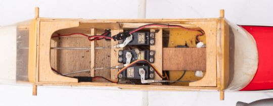 A remote control model Cessna 40 aircraft. Scratch built with a balsa fuselage and powered by a Blue Bird no. 5 glow plug engine, finished in white with red and black trim complete with remote control and accessories etc, wing span 162cm.