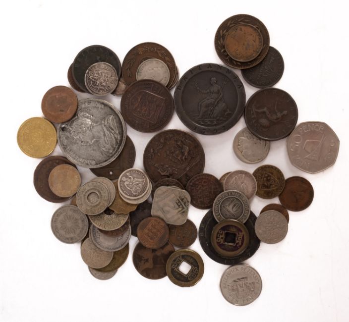 A mixed bag of world coins, including a 1797 Cartwheel Twopence and Penny, an 1821 George IV bronze Coronation Medallion, an 1877cc USA Dime, an Advertising Medal for the Prince of Wales Theatre 'The Golden Parisian Revue', an 1853 USA 1 Cent, an 1821 white metal medal 'Caroline: died Aug. 7. 1821', etc.