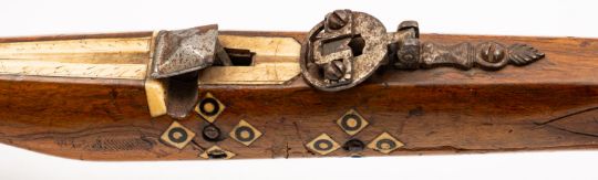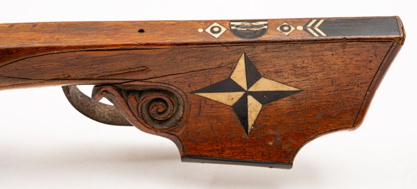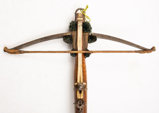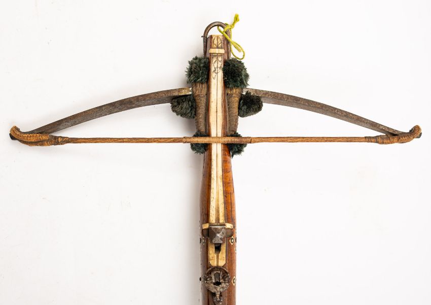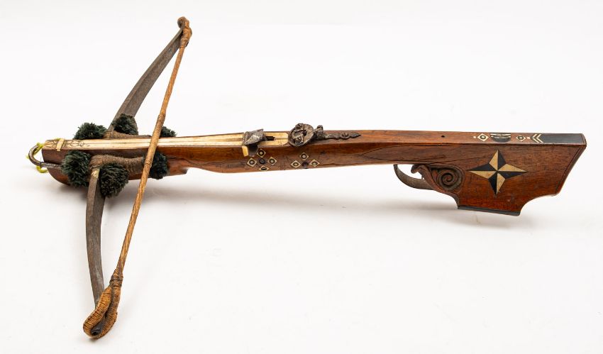 A 19th Century Continental walnut and bone inlaid crossbow. Having a 55cm wide steel bow with rope string, mounted on a walnut stock with horn butt plate, steel guard trigger and sight, the bone tiller engraved with foliate decoration, 68cm long,