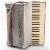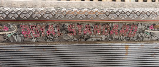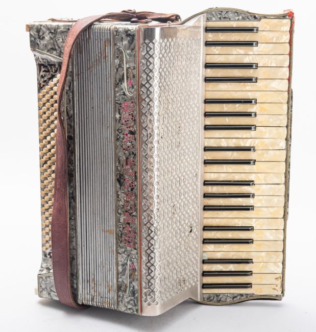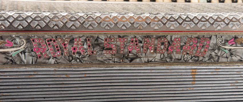 A Royal Standard 120 key accordion in silver with pink lettering, studded decoration and leather strap.