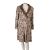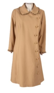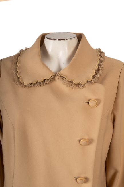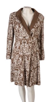 Two lady's coats, including a polyester beige coat by 'Cresta' with a scalloped and crepe collar, size 18, together with a 1990's long brown and white scrolling foliage design coat, approx UK size 16. (2)