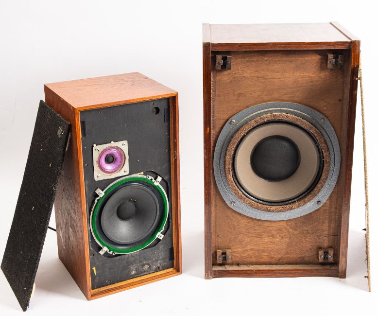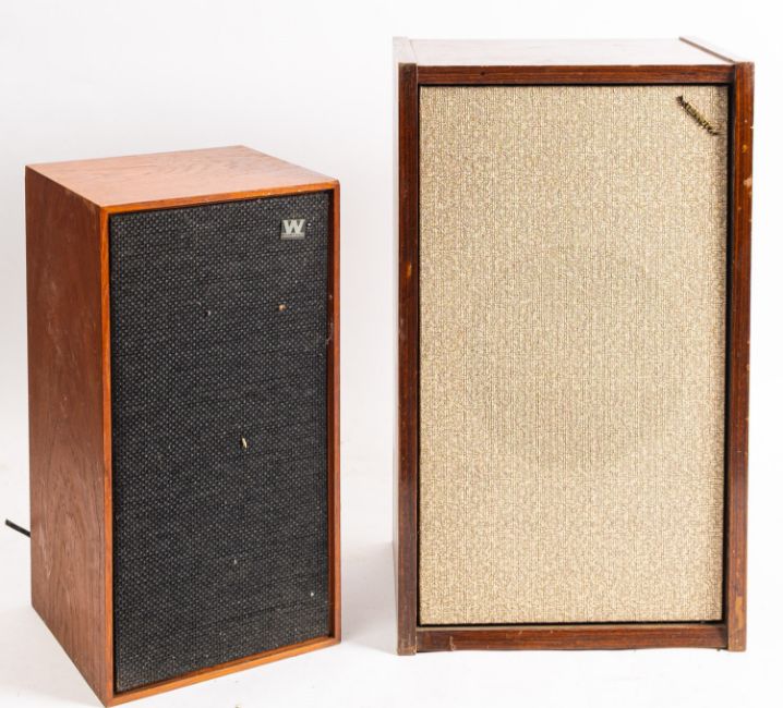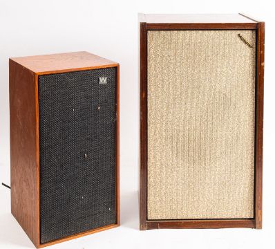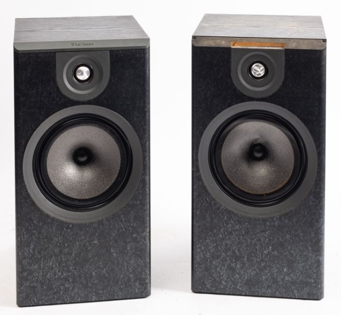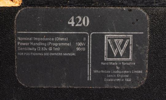 A pair of Wharfedale 420 ebonised wooden speakers. Makers stamp to the front, 48cm high, 26cm wide, 28cm deep, together with a Wharfedale Linton 2 speaker, a Tannoy 3L speaker and an Armstrong model 227M amplifier.