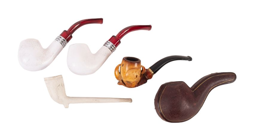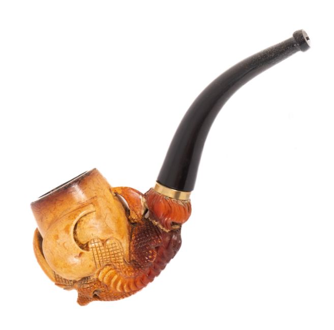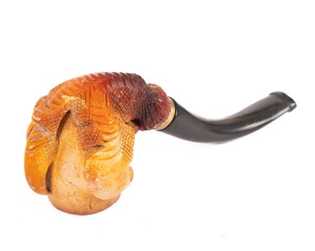 An early 20th Century carved Meerschaum pipe. The bowl held in eagles talons with gold coloured mounting on an ebonised stem. In leather pipe case together with three other Meerschaum pipes.