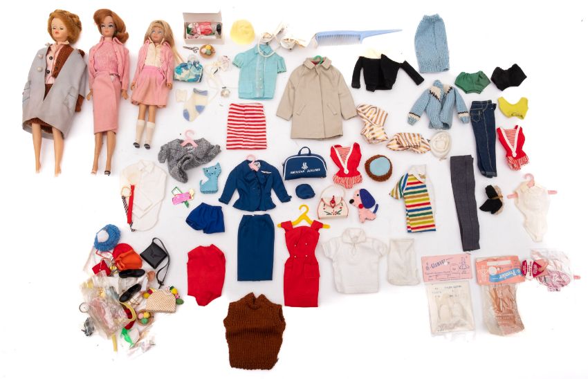 Three Mattell Barbie dolls. One having articulated joints, together with various clothing and accessories.