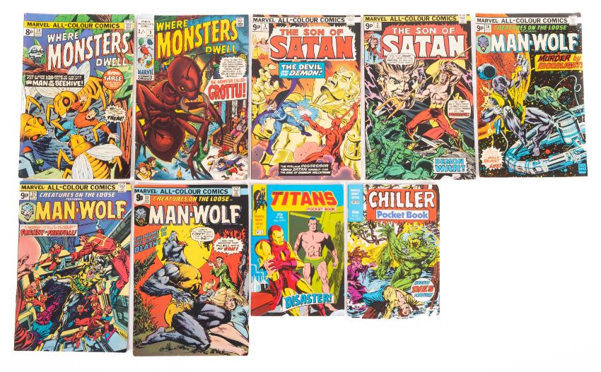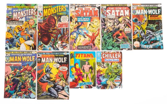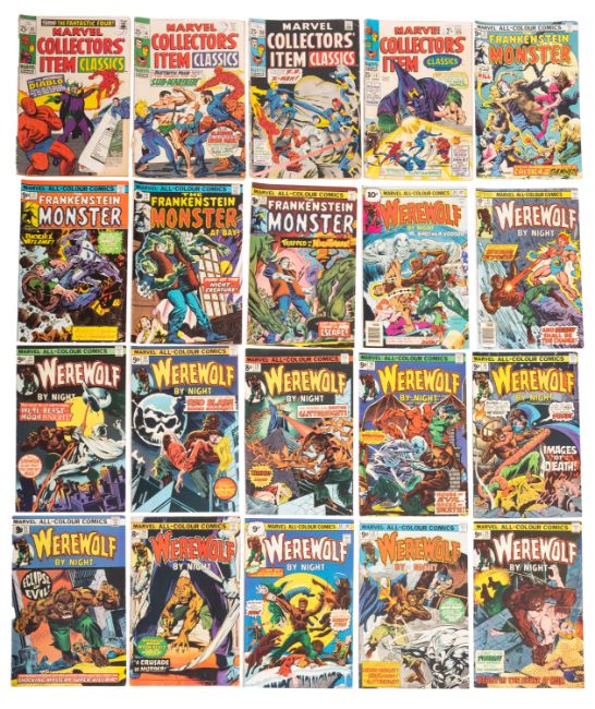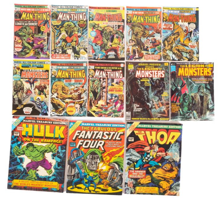 A collection of Marvel comics including 'Werewolf By Night' (12), 'The Man-Thing' (7), 'The Frankenstein Monster' (4), 'Marvel Collectors' Item Classics' (4), 'Marvel Treasury Edition' (3), 'The Legion of Monsters' (No. 1, No. 8, No. 28) and various others (29)