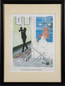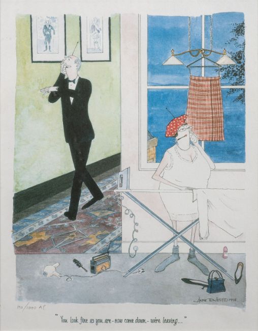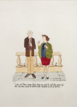 Annie Tempest (British b 1959) -'Look out ! Here comes that chap we used to call the exorcist - the one who came to dinner and cleared us out of spirits ..' -Pen, ink and watercolour -37.5 x 27.5cm, 56 x 45cm framed -Signed lower right and dated 2003 -Together with a print 'You look fine as you are - now come down - we're leaving ...' 29 x 22.5cm, 43 x 43 framed. Numbered 190/1000 AP by the same hand. (2)