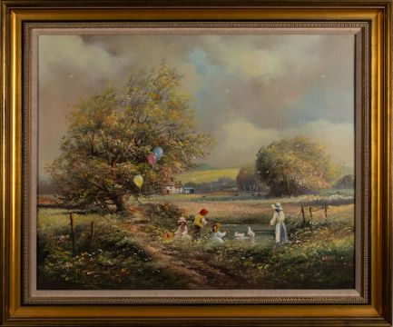 *Ted Dyer (British, b 1940) -Children playing by a pond in a wild flower meadow -Oil on canvas -40 x 49.5cm, 50 x 60cm framed -Signed lower left.