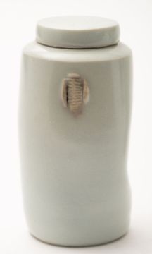 *Edmund de Waal [b 1964] an altered porcelain jar and cover under a pale celadon glaze with impressed manganese stained character marks, 11cm high.