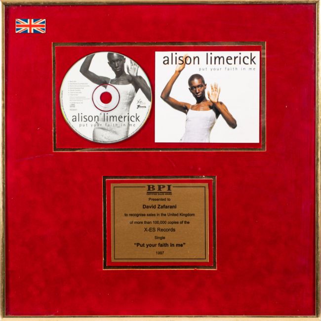 A Gold disc awarded to David Zafarani for the single 'Put Your Faith in Me'. Set on a red ground together with a conforming CD, both framed and glazed, largest 52cm high, 41cm wide.