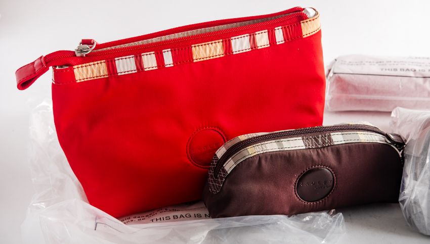 Radley. Two 'Putney' cosmetic bags with two matching pencil cases in red and brown. All items in original packaging and tags and in unused condition. (4)