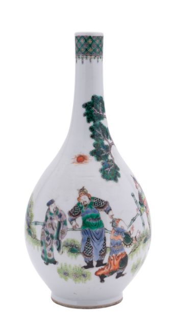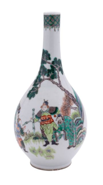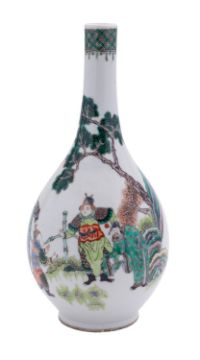 A Chinese famille verte bottle vase, late Qing painted with a boy entertaining Immortals in a garden with rockwork, a pine tree and a bamboo fence, double circle mark, 25cm.