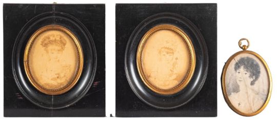 A Collection of five of photographic and reproduction portrait miniatures - Various sizes in period frames, 15 x 12.5cm framed and smaller. (5)