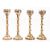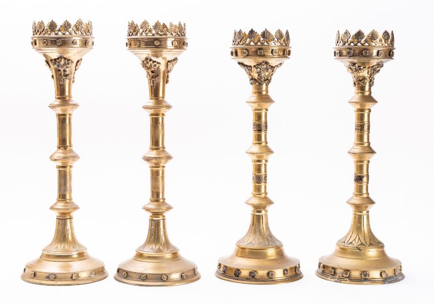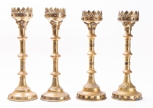 Two pairs of brass altar pricket candlesticks in Gothic taste, 20th century; all with foliate crenelations and knopped shafts to spreading bases; 50.5 and 49cm high respectively