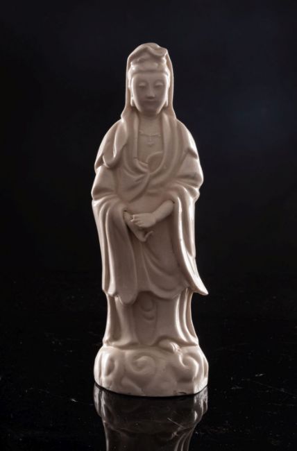 A Chinese Dehua figure of Guanyin, Qing Dynasty the deity wearing flowing robes and on cloud base, 18th/19th century, 23cm [losses to fingers, firing cracks to base].