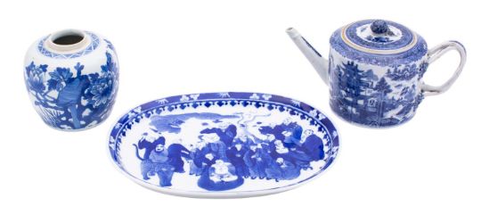 A mixed lot of Chinese blue and white porcelain, Qing dynasty and later comprising: a cylindrical teapot and cover with entwined handle painted with a pagoda lake landscape, 25cm [spout restored, interior star crack]; a globular jar painted with peonies, butterflies and a bird, drilled double circles mark, 12cm; and an oval tray painted with Immortals and attendants, 30cm [3].