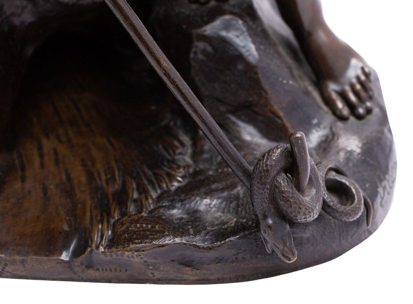 Paul Joseph Raymond Gayrard (French, 1807-1855); a fine patinated bronze group of a youth and a maiden, late 19th century; portrayed as nude and resting against a rock outcrop, looking fixedly down at a serpent entwined in the crook of a stick, held in the youth's right hand; inscribed 'Gayrard Scpt' in the maquette to one side and 'Vittoz Bronzier' for the founder to the other; 49cm high, 42cm wide