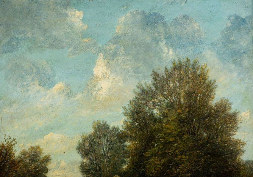 British School, 19th Century - Figures on a bridge crossing a river, cattle beyond - Oil on board - 48 x 45.5cm, 72.5 x 69.5cm framed.
