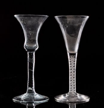 An English wine glass the trumpet shaped bowl set on a straight double series opaque twist stem set on a conical foot, 17cm high, circa 1760, together with a later Dutch wine glass, 17cm high. [2]