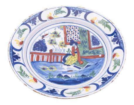 A Bristol [Limekiln Lane] polychrome delftware charger, circa 1730-40, painted in Niglett style with a Chinese lady seated on a terrace, the rim with panels of flower sprays, numeral 7 to the reverse, 33cm [minor glaze losses to rim].