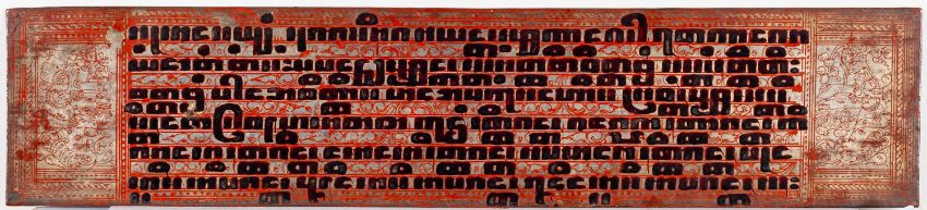 A set of eight Burmese Kammavaca Buddhist manuscript leaves, late 19th/early 20th century each lacquered in red, black and gilt with square script relating to monastic life and ordination, 55 x 13cm [minor damage].
