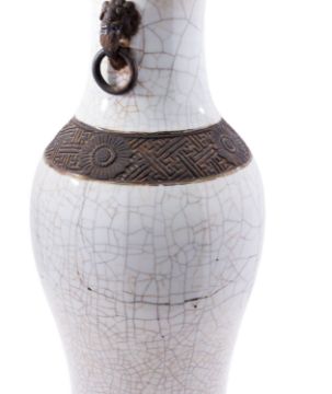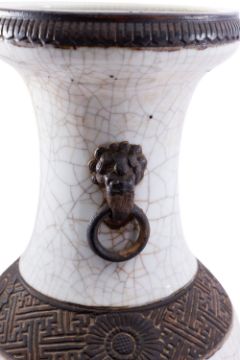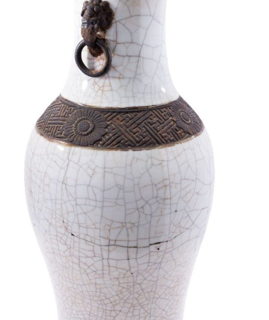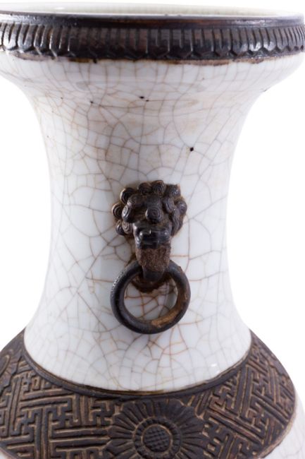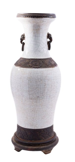 A large Chinese crackle-glazed baluster vase, late Qing dynasty with imitation bronze mounts and mythical beast loose ring handles, 62cm [firing crack] wood stand.