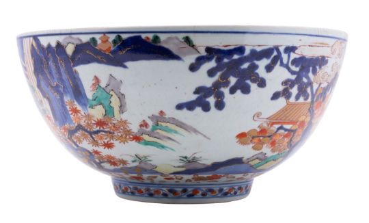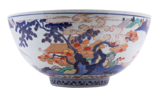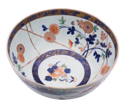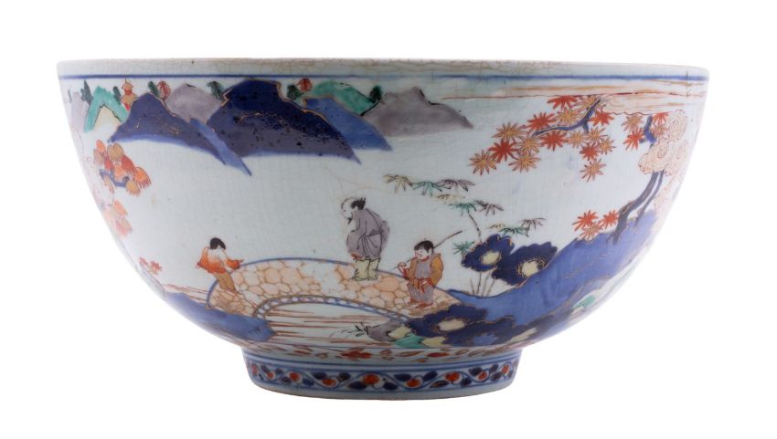 A large Japanese Arita bowl, Edo period/18th century painted in the Imari palette with a continuous lake landscape scene with figures on a bridge, the interior with leafy peony and chrysanthemum sprays, the base marked with a chrysanthemum mon within a circle, 38 cm [rim crack and glaze crazing].