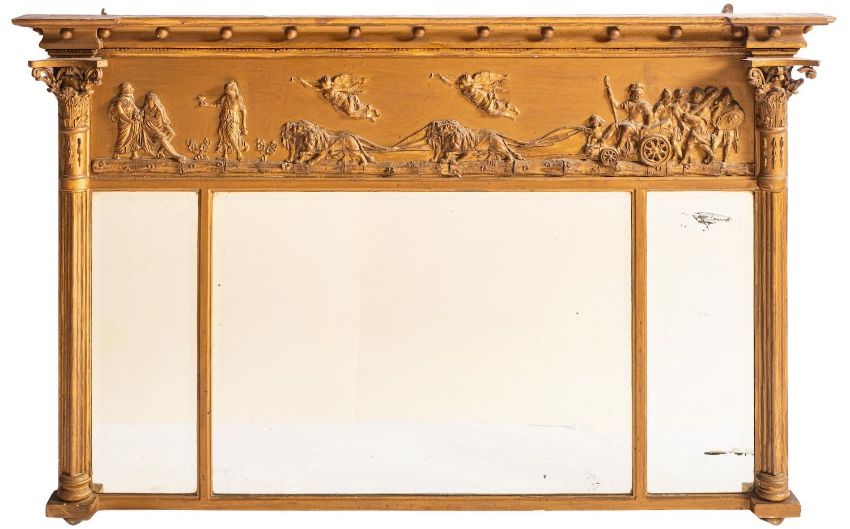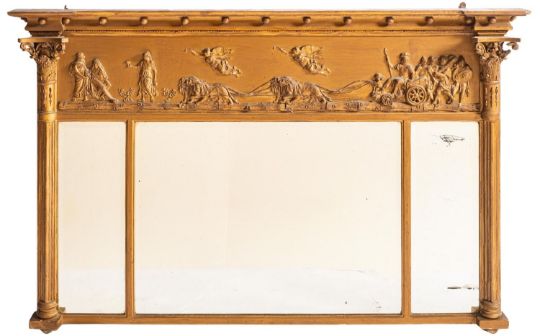 A 19th Century later gilt decorated landscape overmantel mirror, the moulded cornice of recessed broken outline with ball ornament, the frieze with a classical procession of figures and lion drawn chariot with trumpeting angels above, the triple divided bevelled plate flanked by reeded half columns with Corinthian capitals, 89cm x 143cm.