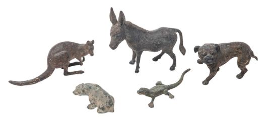 A group of five various Austrian cold painted bronze models of animals, early 20th century; comprising a French bulldog, stamped 'GESCHUTZT STB' for Stefan Buchinger, 5cm long; an ass, 7cm high; a kangaroo, indistinct stamps to underside, 7cm long; a lizard, stamped 'GESCHUTZT', 6cm; and a bear cub, 3.25cm (later repainted)