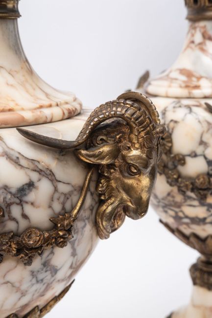 A pair of Continental gilt bronze mounted Breccia marble urns, in Louis XVI style, late 19th century; with pineapple finials to domed tops, each above a collar vent and spreading neck; the ovoid bodies each with twin ram's mask handles supporting floral festoons; above spreading stems with foliate cast mounts, to square bases; 49cm high