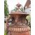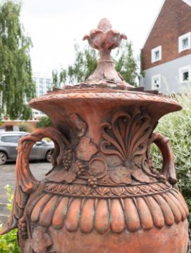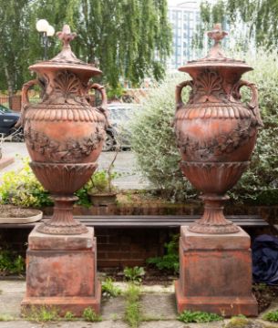 A pair of substantial faux terracotta garden urns on plinths, 20th century; the lift-off lids each with fir cone finial and grape vine on fixed leaf mouldings; the urns with everted rims and waisted necks with anthemia and further fruiting vine mouldings, issuing looped handles to lobed shoulders; above fruiting vine festoons, fluted stems and square bases; on square section plinths with moulded bases; 208cm high overall, 65cm wide