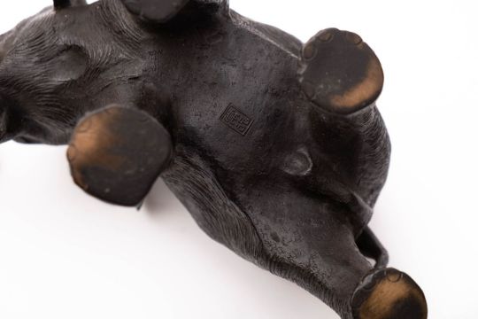 A Japanese bronze okimono of an elephant by Tsukahara Tsunemitsu, Meiji period, naturalistically modelled standing four square with trunk raised, signed in rectangular reserve, 19cm.